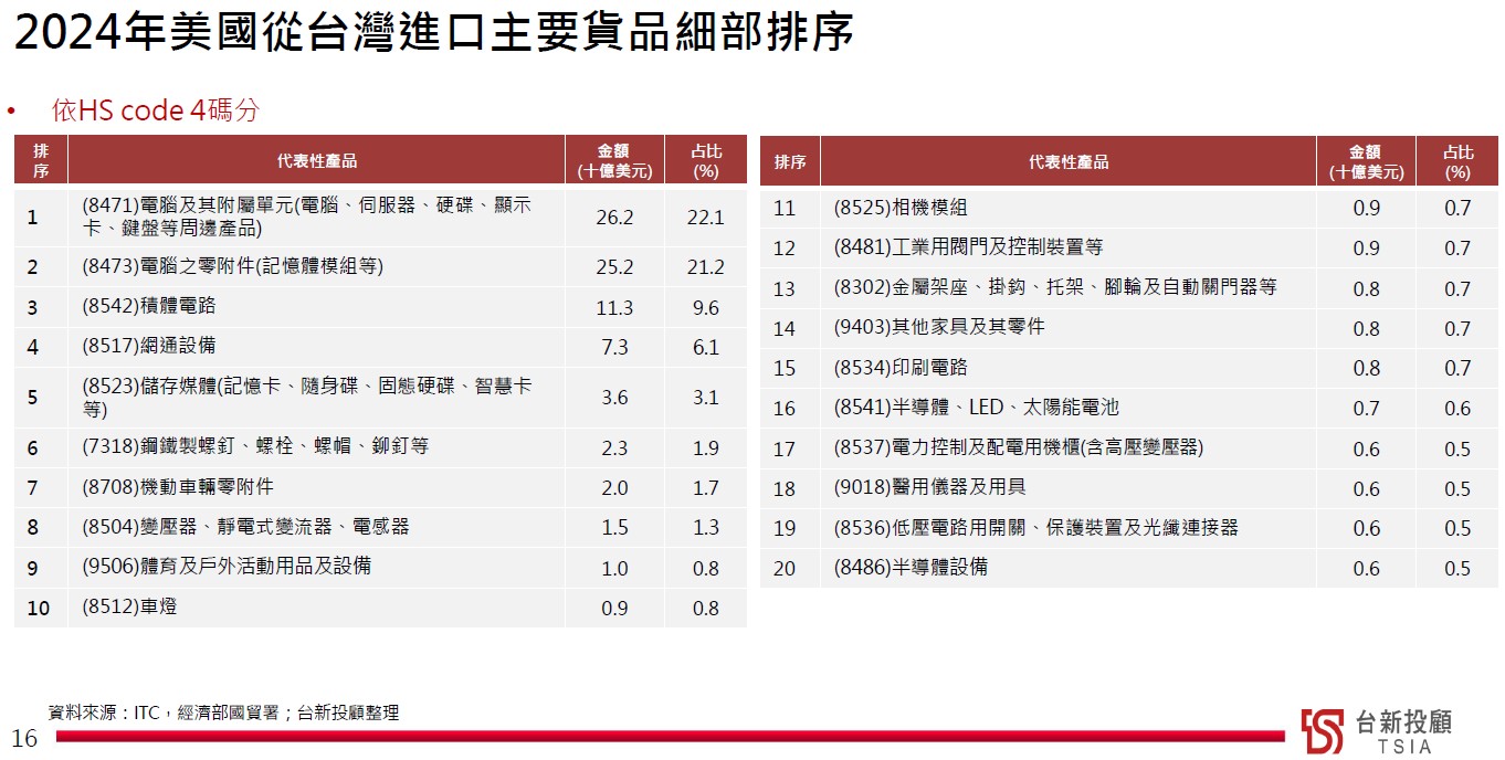 板卡部分,近年供應鏈已由中國移轉至台灣,亦將受對等關稅影響,台新投顧分析,華碩(2357)及技嘉(2376)約3成營收來自板卡,微星(2377)約48%營收來自板卡,且美國地區出貨比重約2成,預估對等關稅將影響中低個位數百分比營收,預期板卡品牌廠將調漲價格因應,不利板卡需求。