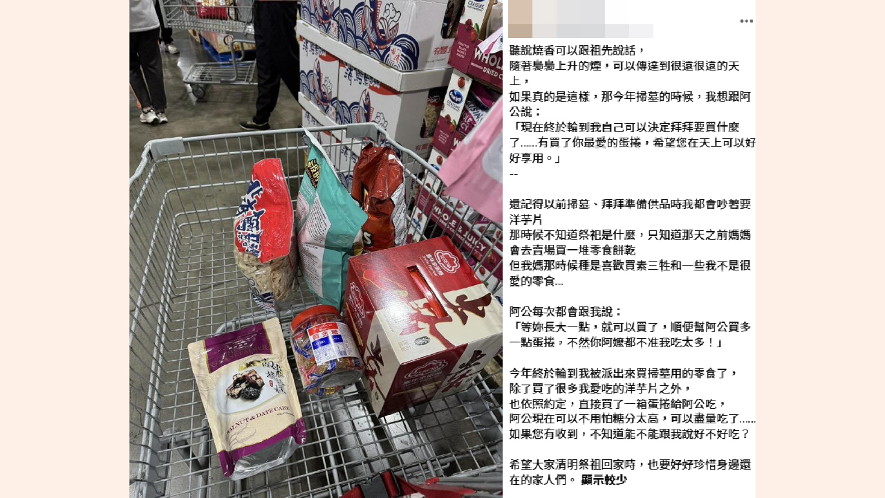 這位網友在貼文中提到,小時候對祭祖的概念不清,只知道媽媽會準備一大堆餅乾零食,但往往不是自己喜歡的那種。唯一期待的,是能跟著去賣場「搶洋芋片」。不過每到清明前夕,阿公總會說:「等妳長大一點,就可以買了,順便幫阿公買多一點蛋捲,不然你阿嬤都不准我吃太多!」