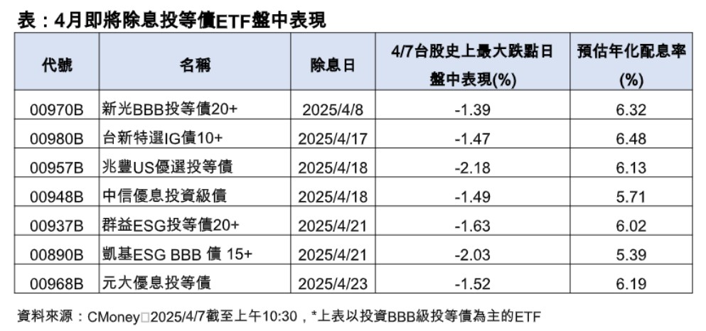 另外,海外投等債ETF跌幅也相對較輕,像是4月即將除息的投等債ETF,例如新光00970B、台新00980B等投等債ETF,盤中跌幅不到2%。