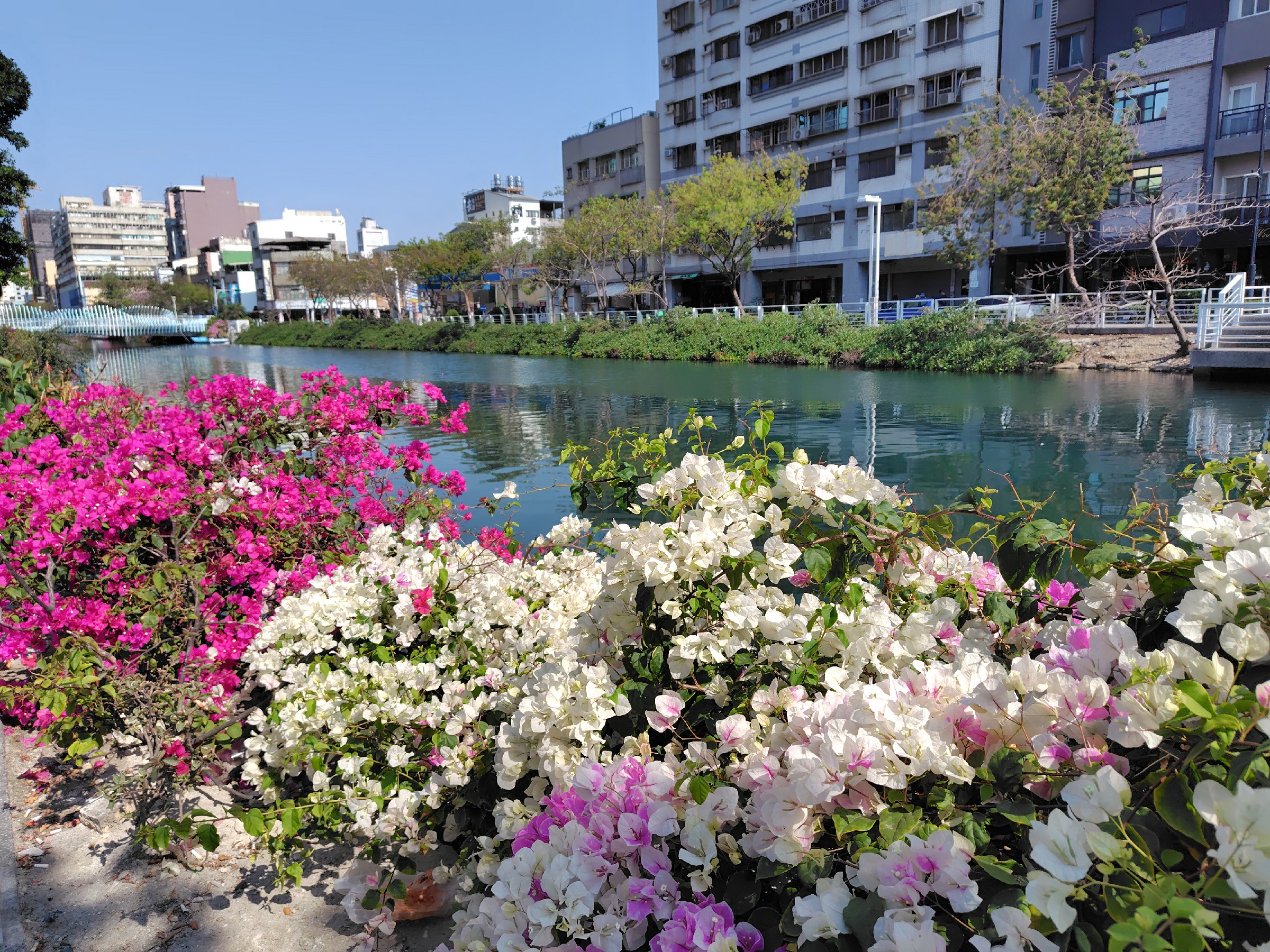 ↑圖說:九重葛與河水波光相映,構成一幅詩意盎然的春日畫卷。(圖片來源:高雄市工務局提供)