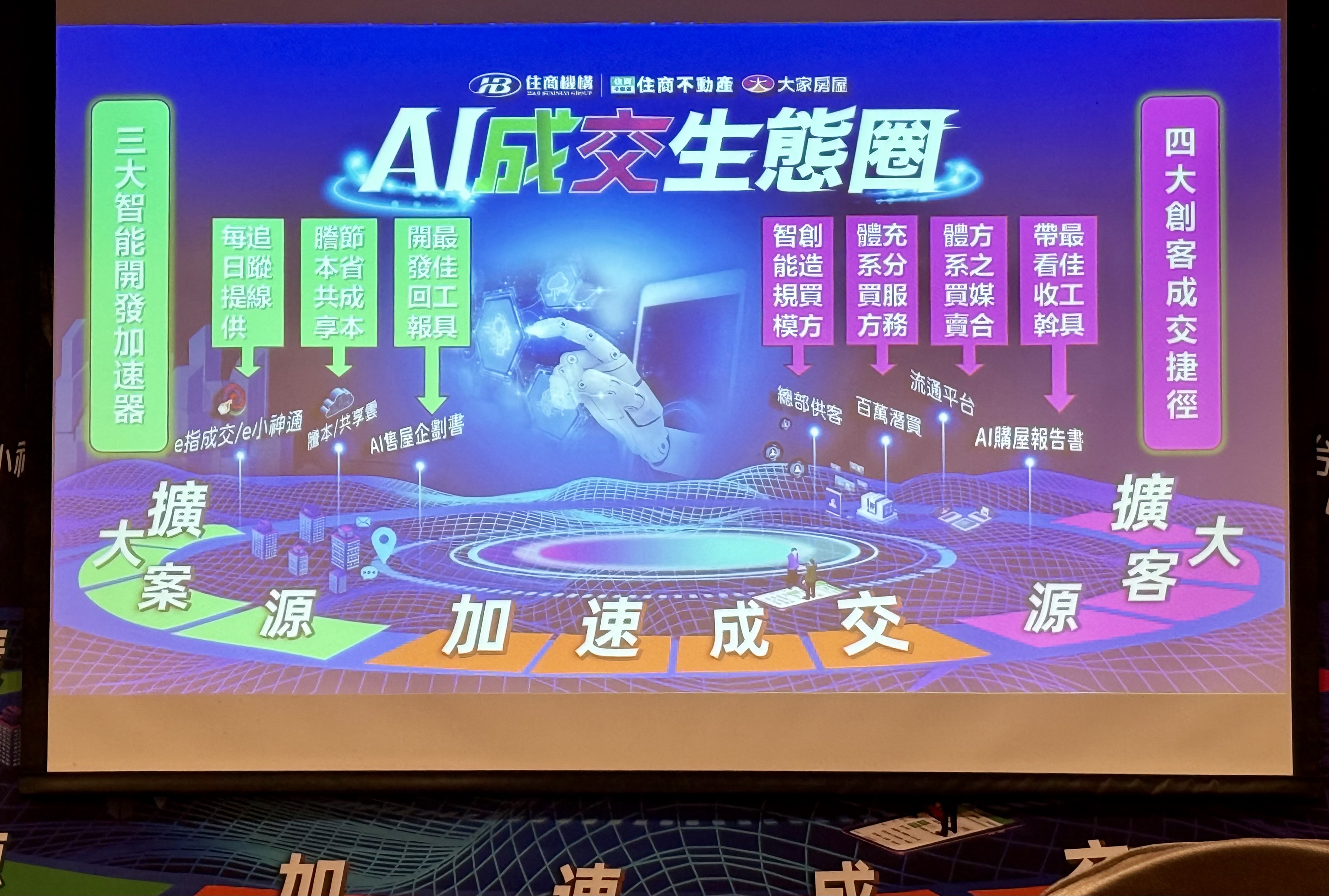 住商機構看見AI趨勢,首開業界先河,斥資數千萬邀請全屋記、住通科技、宏遠電訊、樂居等旗艦級廠商,攜手打造「AI成交生態圈」,住商機構董事長陳錫琮預估將能協助分店提高3成以上的作業效能,第三季將再推出「AI購屋報告書」,幫助房仲快速提案與成交。