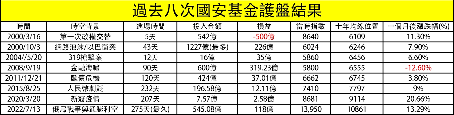 摩爾投顧分析師謝明哲統計國安基金過往8次護盤,第一次是在首次政黨輪替2000年,當年3月進場,指數位置落在8640點,十年線在6109點,高出41.4%,最後虧損5百億元,一個月後,台股上漲11.3%。