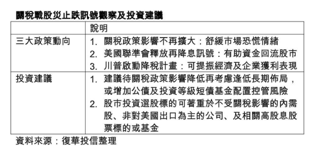 復華投信投研團隊認為,短期龐大賣壓使股市加速趕底,除了留意美股後市,若要危機入市建議觀察3大政策動向再行長期布局,波動加大期間建議增加公債、投資等級短債基金配置控管風險,股市布局建議移往較不受關稅影響的內需、非對美出口為主公司及相關高股息標的或基金。