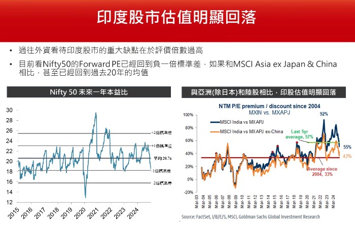 張諺祺指出,這次印度股市回檔,也使高評價回歸均值,且印度央行啟動降息,金融環境轉向寬鬆,皆有助引導印度股市回歸正軌,產業方面,包括金融類股、航空旅遊概念股及軍工產業鏈股可關注。