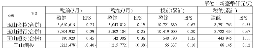 玉山金3月自結稅後盈餘30.4億元,累計首季稅後盈餘87.9億元,創歷年同期最高獲利,年增40.67%,EPS為0.55元,超越了兆豐金。