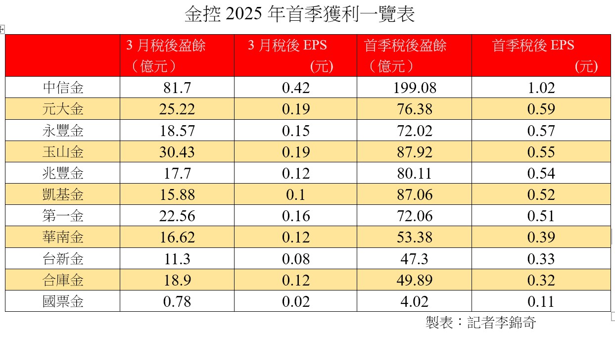 金控首季獲利相繼公布出爐,其中,中信金控合併稅後盈餘199.08億元,每股稅後盈餘(EPS)1.02元,在已公布同業中暫時領先;玉山金首季稅後盈餘87.92億元,創同期歷史新高,EPS為0.55元,表現搶眼。