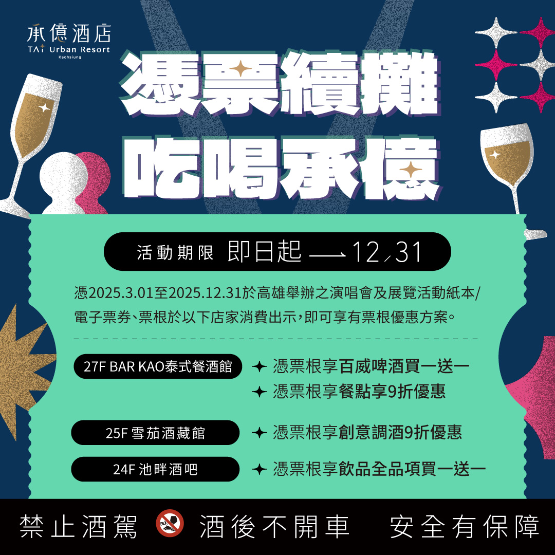 承億酒店不僅以最美夜景邀請旅人放慢腳步,更加碼推出年度「憑票續攤」優惠,自即日起至2025年12月31日止,凡持高雄各大演唱會或展覽票根,無論是紙本或電子票券,至承億酒店旗下餐飲空間消費皆享多重好康:27樓BAR KAO泰式餐酒館啤酒買一送一、餐點九折,25樓雪茄酒藏館創意調酒九折,24樓池畔酒吧則提供全品項飲品買一送一。