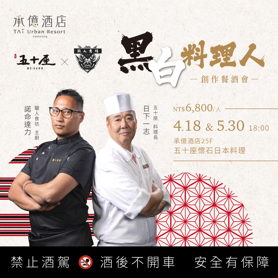 而在音樂與美酒之外,承億酒店更邀請饕客一同探索味蕾的極致旅程。25樓高端日式料理餐廳「五十座」將於4月18日與5月30日舉辦兩場「黑白料理人」餐酒會,由精通京懷石的料理長日下一志攜手原住民私廚「獵人食坊」主廚諾命達力,共同演繹日本精緻料理與台灣部落風味的跨界對話。