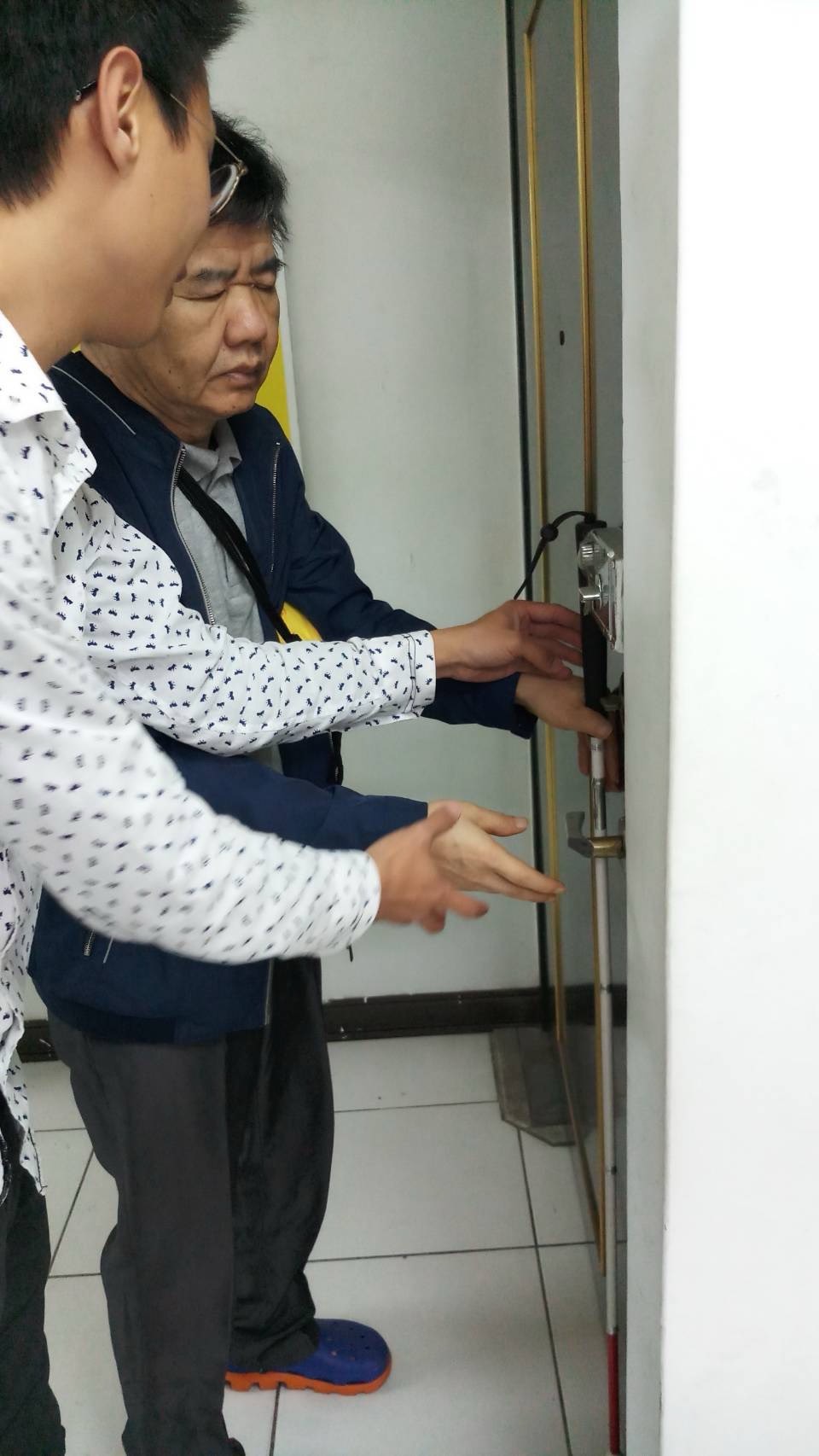 ↑圖說:阿澤進行定向訓練,使用手杖探測門把位置。(圖片來源:高雄市社會局提供)