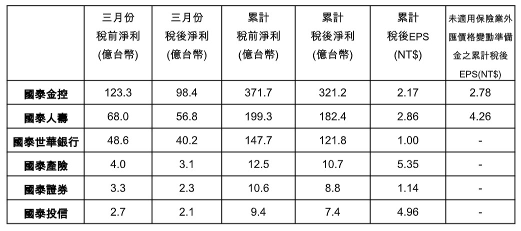 獲利亞軍國泰金3月稅後淨利98.4億元,首季稅後淨利321.2億元,EPS為2.17元。子公司國泰世華銀行、國泰產險及國泰投信,首季稅後淨利續創歷史新高。