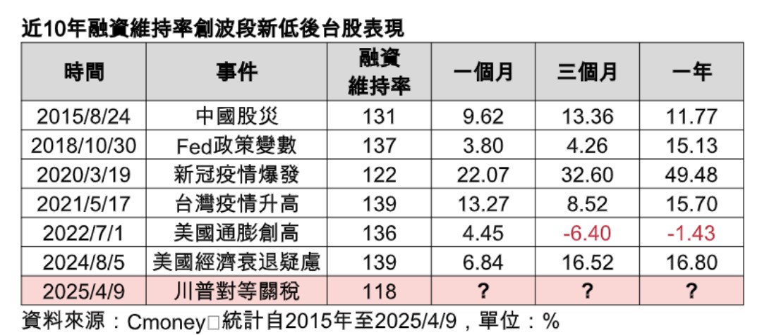 復華投信指出,台股本周三個交易日重挫近2成,龐大斷頭賣壓讓上市融資維持率9日掉至118.1%,超越金融海嘯期間的118.2%,創下歷史新低。據統計,近10年當融資融維持率低於140%,創波段新低後進場布局台股,在後1個月、3個月、1年皆有雙位數漲幅反彈,其中近1年平均漲幅更有近18%。