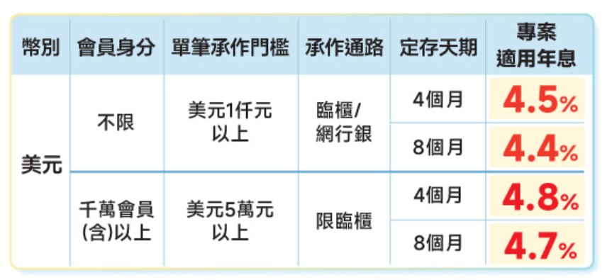 另外,不論是否為千萬會員,台新銀行亦提供單筆承作門檻只要1000美元的親民方案,美元4個月定存年息4.5%、8個月定存年息4.4%,額度有限額滿為止。