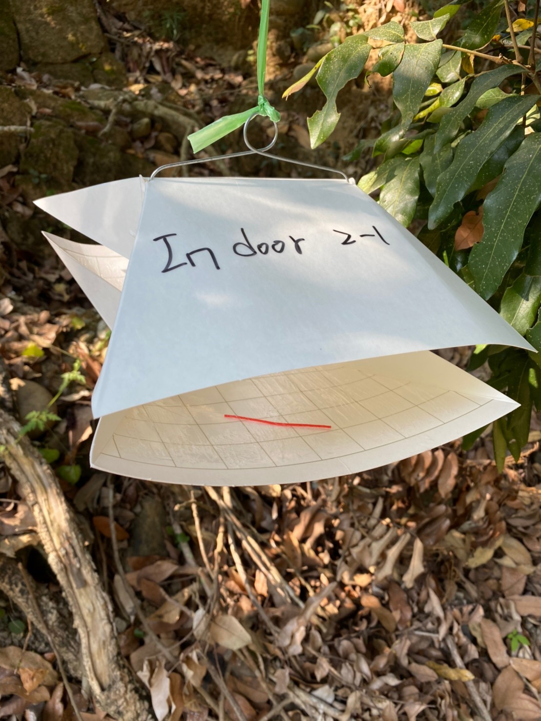 ↑圖說:於荔枝園懸掛荔枝細蛾的性費洛蒙誘引器(圖片來源:嘉義大學林彥伯教授提供)