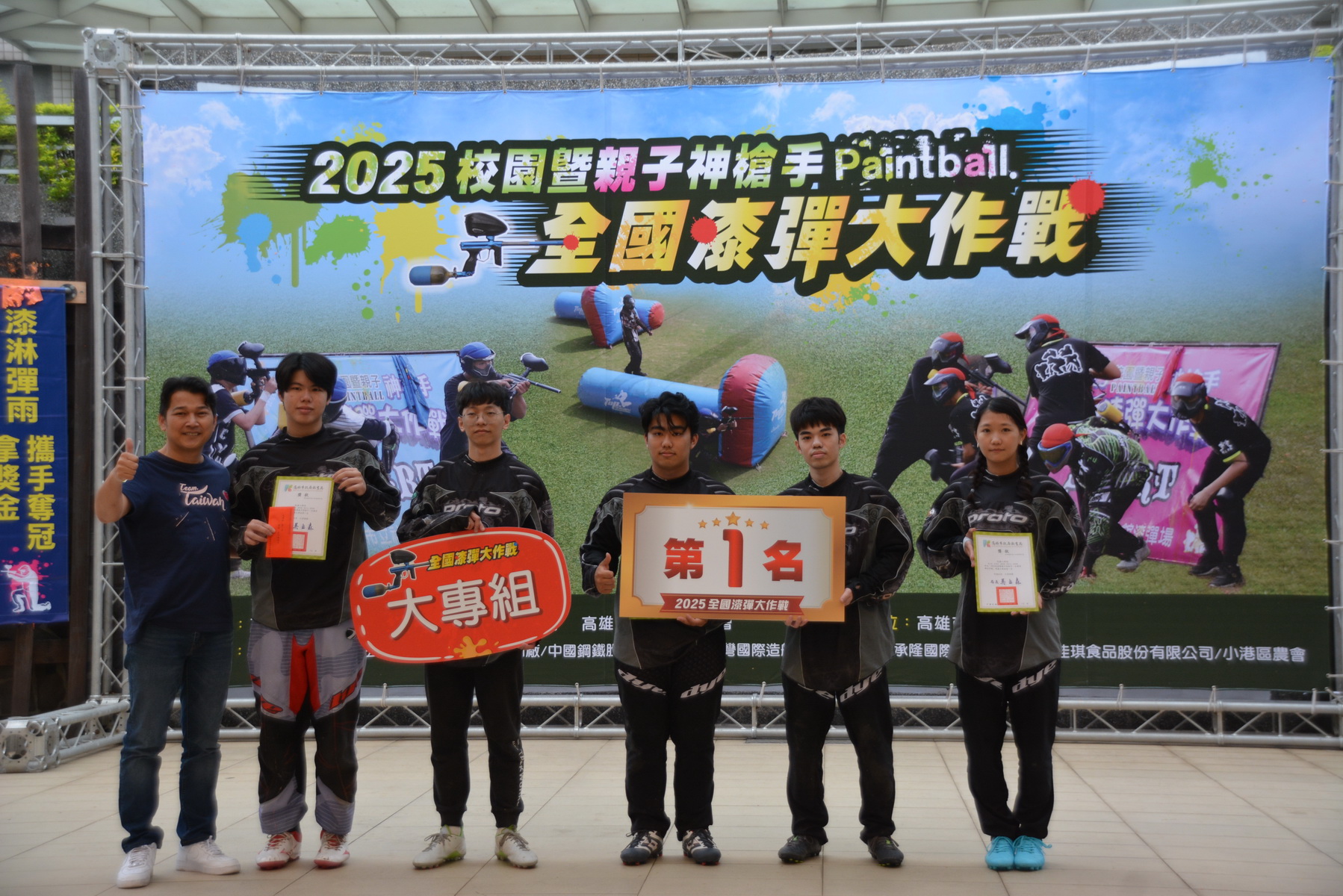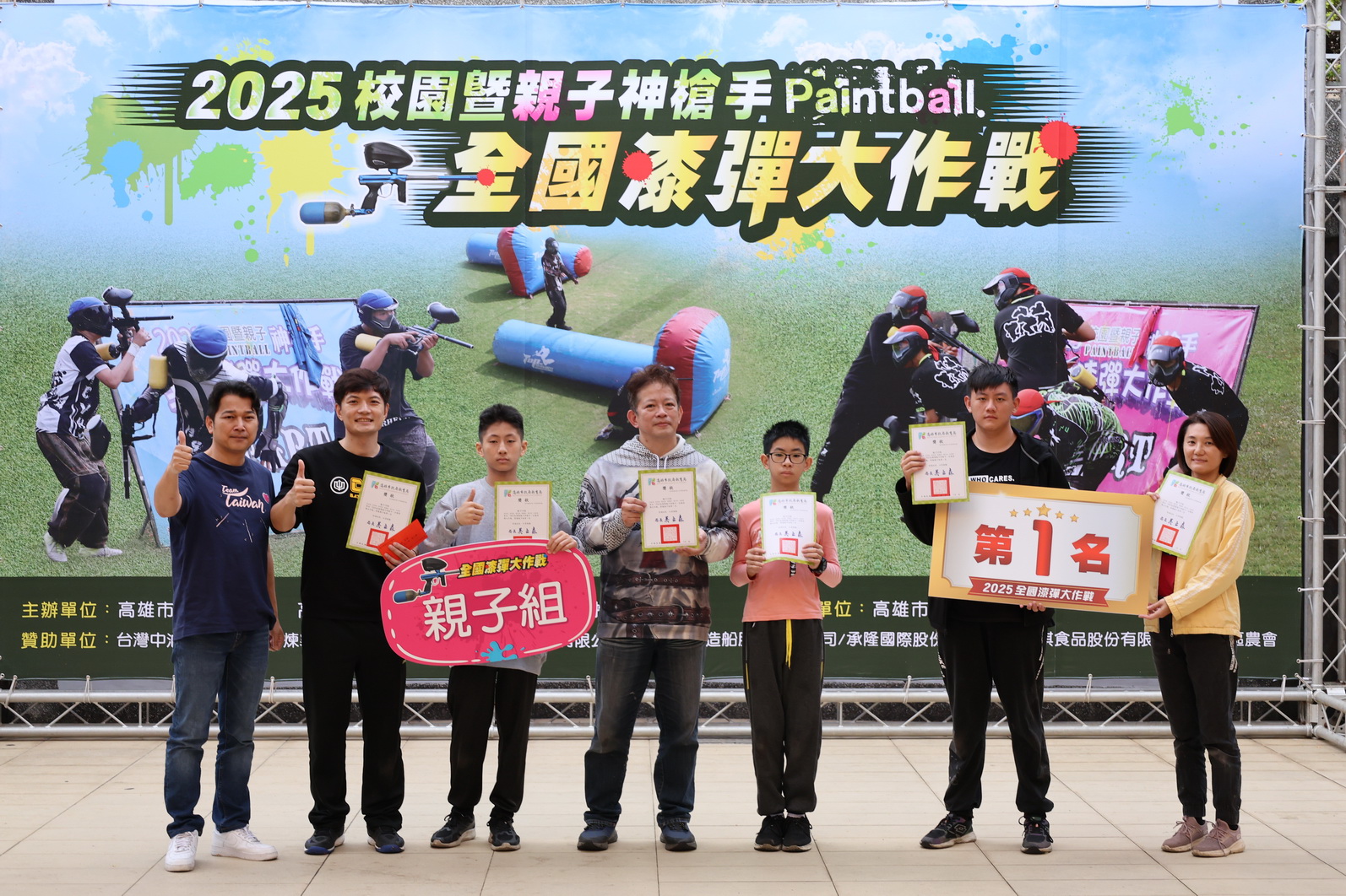 這場漆彈大賽戰況激烈,最後親子組由「親子10隊」摘金、第二名「親子4隊」、第三名「親子1隊」;大專組第一名「高雄小新隊」稱霸、第二名「打爆你對不隊」;國中組冠軍為「大象補習班隊」、第二名「小港國中A隊」、第三名「只要有興仁隊」、第四名「超級想贏隊」;高中組由「雄工C隊」奪冠、第二名「烈焰flames隊」、第三名為「新莊高中B隊」、高中組第四名為「對!你說的都隊」。