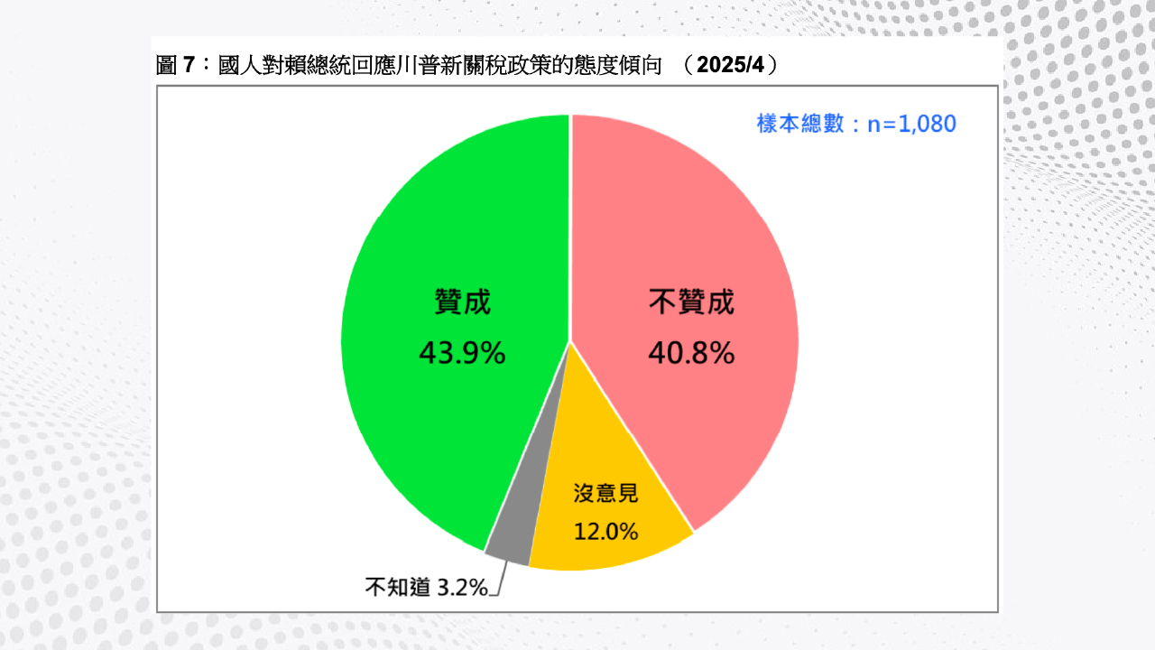 對於政府回應,44%受訪者贊成總統賴清德不報復美國的政策,但仍有41%不表贊同,顯示社會意見分歧。而對於行政院提出880億元的工農產業支援方案,49%肯定、39%不肯定,顯示該政策取得相對溫和的民意支持。