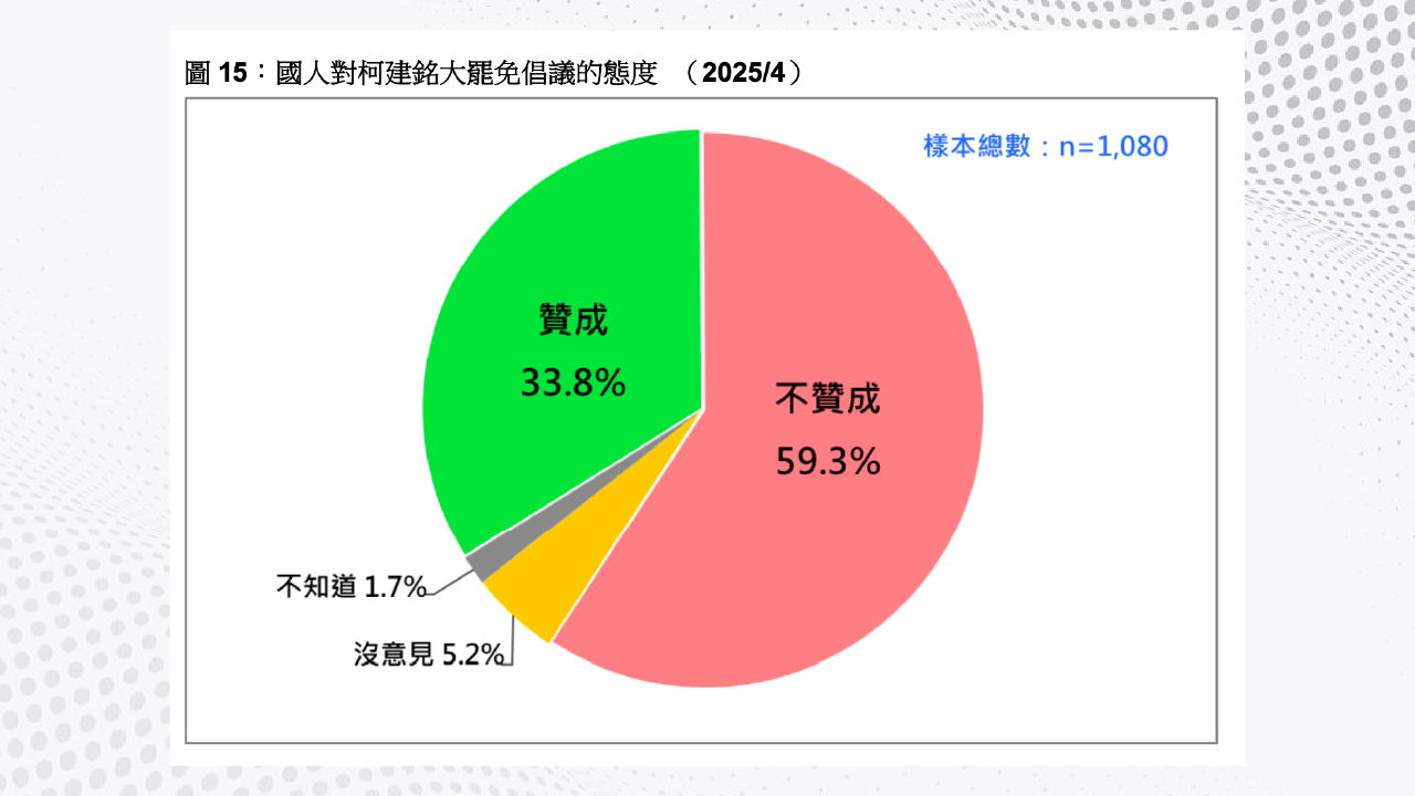 值得關注的是,「大罷免」議題在民意上顯現反彈趨勢。高達59%不贊成大罷免,民眾盼民進黨收手!對民進黨立院總召柯建銘倡議的全面罷免國民黨41席立委,有59%不贊成、僅34%贊成;另有50%認為應停止推動大罷免,反映社會對過度政治動員的疲乏。儘管如此,仍有四成民眾表示可能參與第二階段罷免連署,代表潛在動員仍具能量。