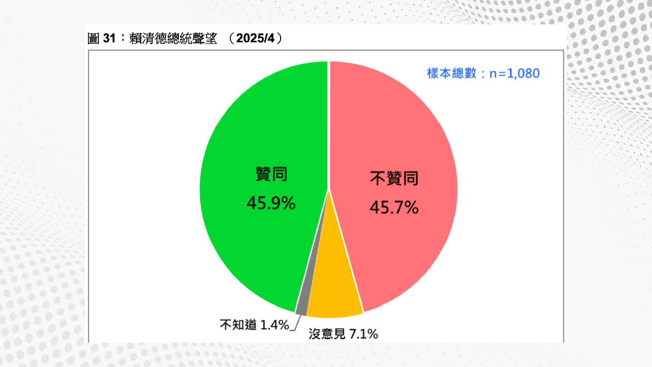 賴清德聲望跌至次低、卓內閣不滿意創新高。總統賴清德與卓榮泰內閣施政表現雙雙出現「死亡交叉」。賴總統聲望為45.9%,比上月下滑3個百分點,創下上任以來次低紀錄;卓內閣施政滿意度降至42%,不滿意度升至46.4%,為上任以來最高,顯示大罷免與川普關稅政策形成的「雙重後座力」正衝擊執政團隊。