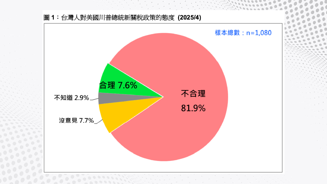 台灣民意基金會今(15)日公布四月全國性民調,在美中角力與對等關稅衝擊下,台灣社會普遍籠罩在不安氛圍中。調查指出,高達86%的受訪者認為美國總統川普提出的對等關稅政策將對台灣經濟帶來重大衝擊,82%認為該政策不合理,顯示民間對國際經貿風險的高度憂慮。