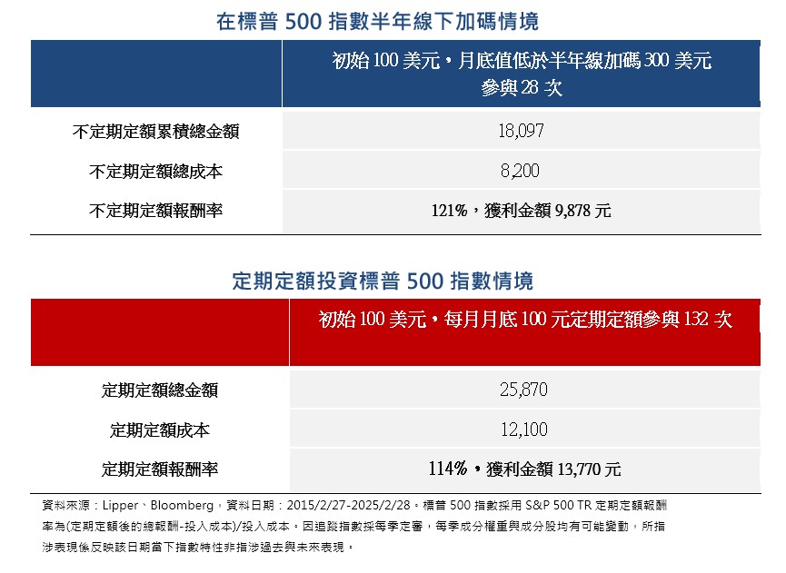 美股反彈,但標普500指數仍未收復月線、季線、半年線、年線,法人統計過往在美股半年線下加碼情境,假設初始100美元布局標普500指數,月底值低於半年線加碼300美元,參與28次,投資成本共計8200美元,累計資產總額達1萬8097美元,獲利9878美元,投資報酬率高達121%。