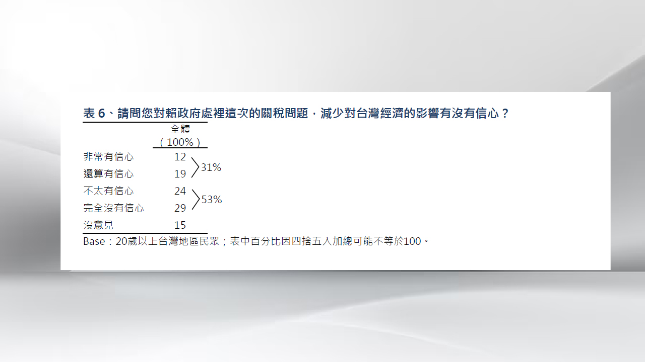 然而,對於賴清德政府的應對措施,民眾普遍信心不足。調查顯示,有高達53%的民眾對政府減少經濟衝擊的能力「沒有信心」,僅31%表示有信心。此外,有51%民眾不滿意賴政府處理關稅問題的表現,僅25%表達滿意,25%未表態。即使川普後來宣布暫緩關稅,滿意度僅微幅上升至28%。