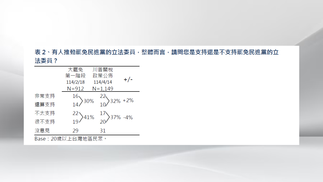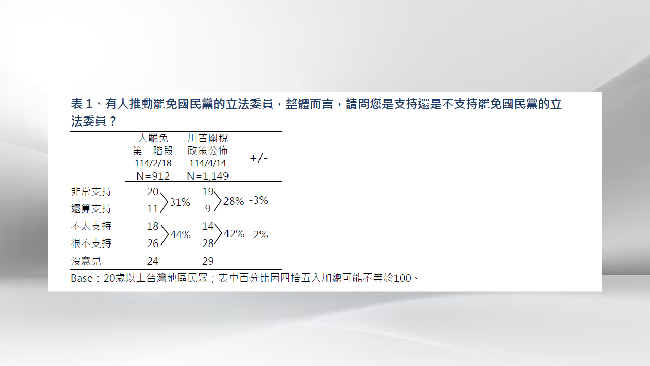 在國內政治議題方面,民調也針對「大罷免」行動進行調查。支持罷免國民黨立委的民眾為28%,略低於2月的31%;不支持者為42%,顯示該議題熱度略為降溫。相較之下,支持罷免民進黨立委的比例為32%,略高於先前的30%;不支持者為37%,仍為相對多數,呈現高度對立局面。