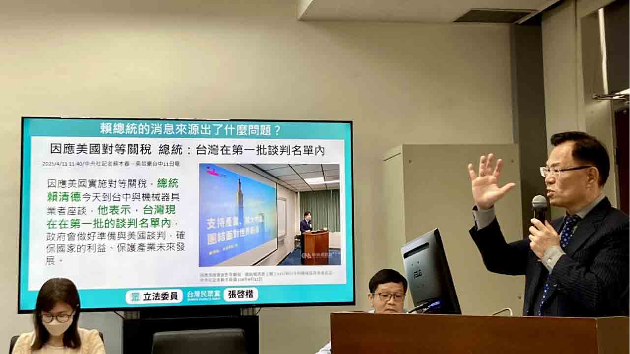 張啓楷指出,總統賴清德日前公開宣稱「台灣在美方對等關稅談判第一批名單內」,然而根據《華爾街日報》報導,美國財政部長僅列出英國、澳洲、日本、南韓與印度五國,台灣並不在其中。張質疑:「政府什麼時候知道我們根本不在首波名單?總統的消息來源出了什麼問題?」