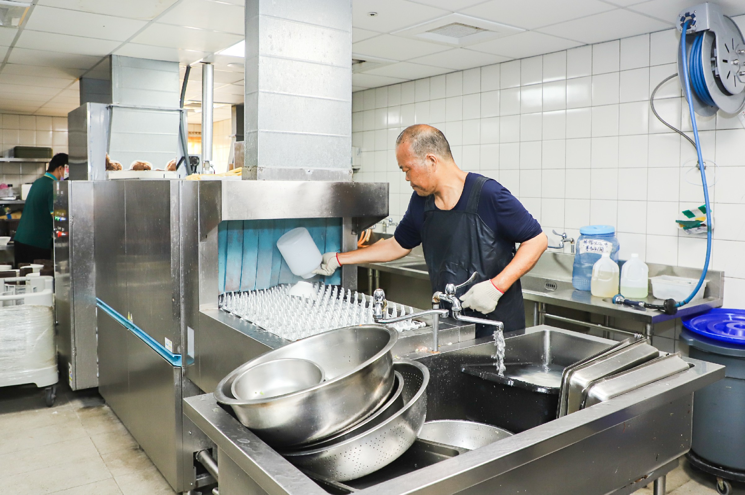 ↑圖說:阿宗進入餐飲部擔任洗滌人員,主管為他彈性調整上班時間,也提供護腰輔具。(圖片來源:嘉義縣勞青處提供)