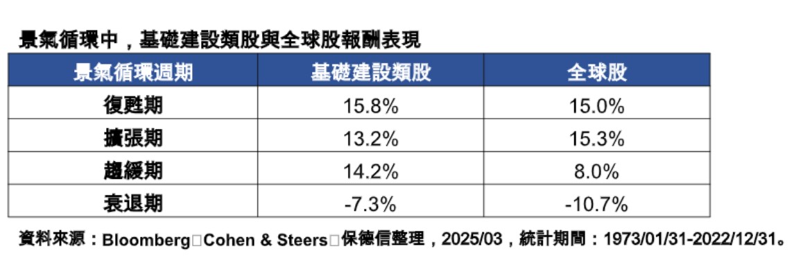 不過,王翔慧指出,根據統計,基礎建設因為產業特性,在經濟趨緩或是衰退期間,表現遠優於大盤,當進入經濟趨緩期,基建類股平均報酬率為14.8%,遠優於大盤的8.0%,倘若經濟真的步入衰退期,基建也展現相對抗跌的特性。