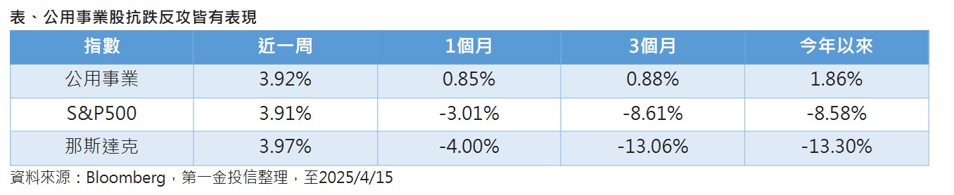 Bloomberg數據統計,今年以來不僅科技為主的那斯達克跌幅高達13%,標普500指數也下跌逾8%,不過,防禦力佳的公用事業類股則逆勢守住正報酬近2%;若觀察政策反覆影響最劇的這1個月,股價瞬間大跌、再大幅反彈,標普500及那斯達克指數跌幅仍達3%至4%,公用事業股則持續展現防護力,上漲近1%。