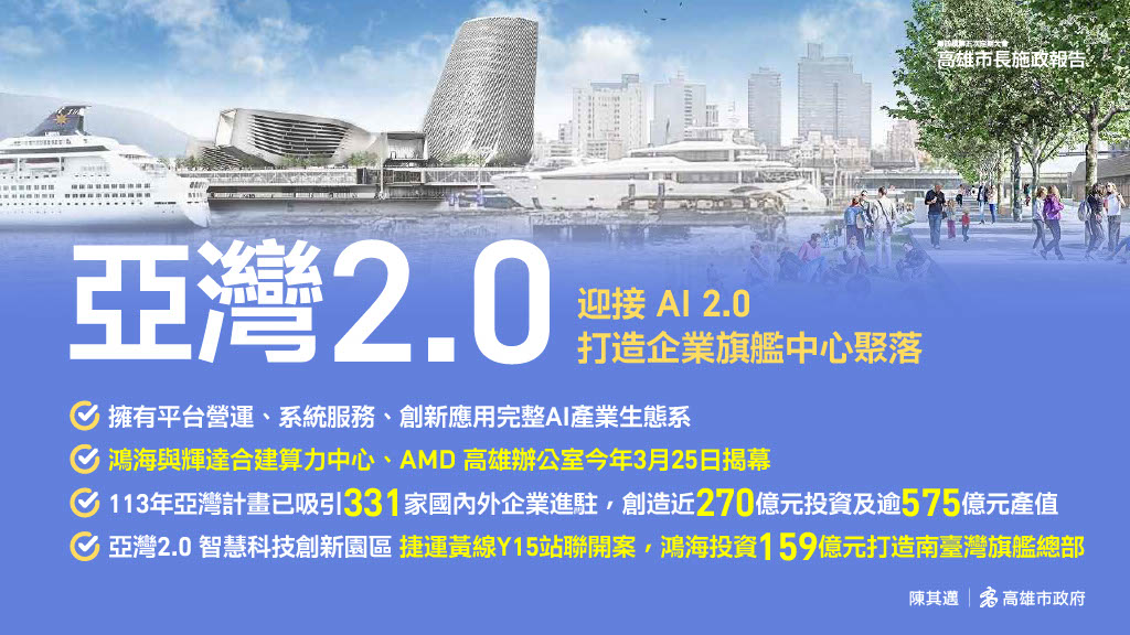 市府指出,亞灣地區近年推動的「亞灣2.0計畫」已吸引331家國內外企業進駐,帶來近270億元直接投資,並創造超過575億元的產值。另有特貿三公辦都更案投入913億元、捷運黃線Y15與鴻海聯開案投入159億元,逐步形成企業總部與商辦聚落,展現亞灣作為高雄未來發展核心區域的實力與潛力。