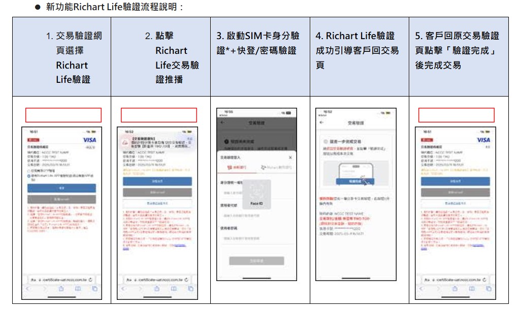 Richart Life進行SIM卡身分驗證,日後台新信用卡線上交易即可透過生物辨識快速完成驗證,不僅解決用戶於海外出遊臨時收不到簡訊的困擾,更能有效防止詐騙集團攔截簡訊OTP驗證碼的風險,讓交易流程既便捷又安全(如下圖,台新銀提供)。