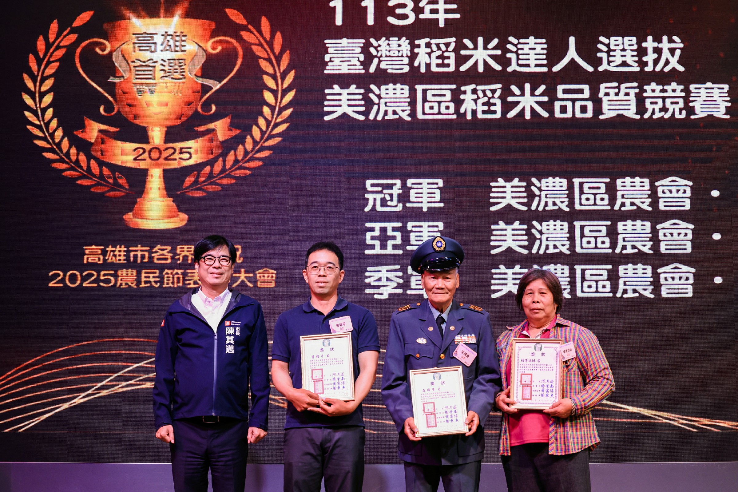 ↑圖說:陳其邁頒獎表揚113年臺灣稻米達人選拔鄉鎮賽。(圖片來源:高雄市政府提供)