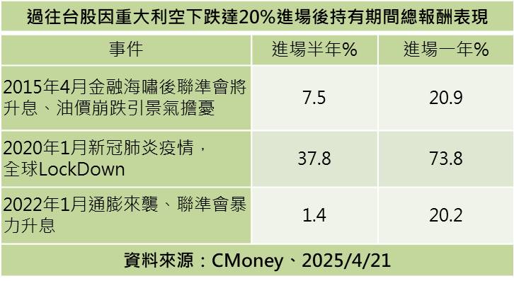 川普對等關稅衝擊,仍讓台股投資信心動盪,今天早盤又下跌超過250點。不過,法人統計過往台股重大利空而重挫超過20%,逢低進場布局勝算高。至於這次能否歷史重演,有待後續驗證。