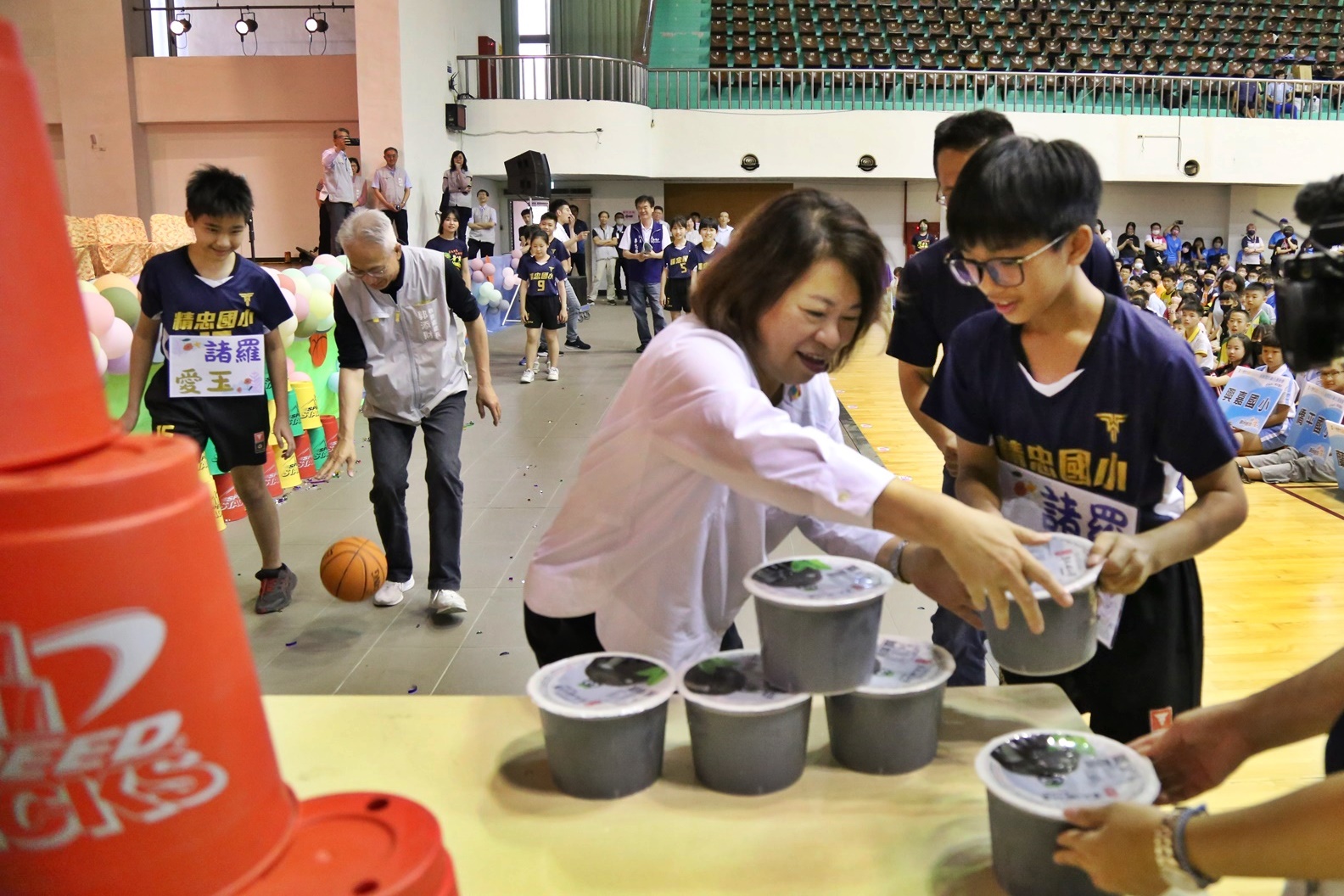 ↑圖說:黃敏惠與小朋友組成「仙草隊」,一同體驗運球過關與疊杯接力。(圖片來源:嘉義市教育處提供)