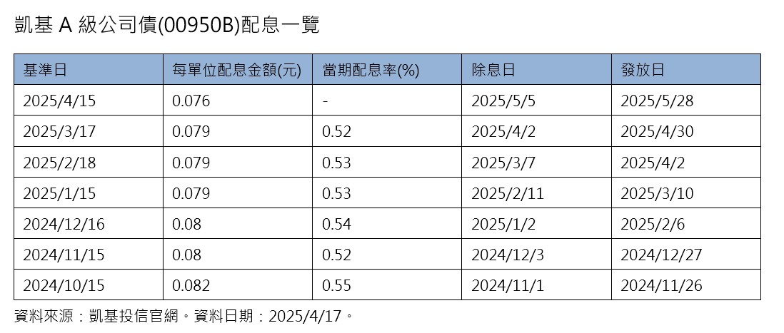 全台首檔設計月中評價、月底除息的月配債券ETF:凱基A級公司債,00950B),公告成立以來第七次配息,預計每受益權單位數配發0.076元,除息日訂於5月5日,有意參與本次除息的投資人,最後買進日為5月2日,預計5月28日發放配息。