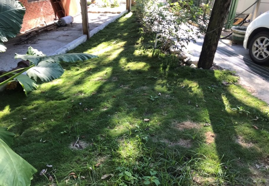 ↑圖說:桃源國小校區周遭雜草叢生的空地通舖草毯並搭配在地石材及姑婆芋,綠化環境的同時也拉近人與自然的距離。(圖片來源:高雄市工務局提供)