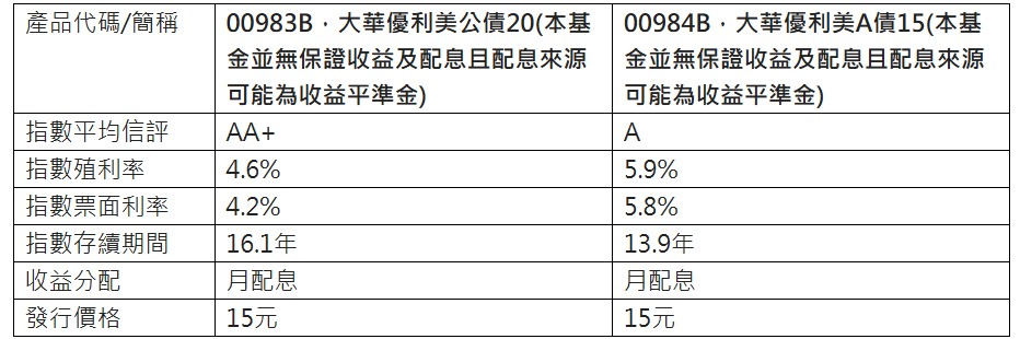 看準投資人對於優質收益的需求,大華銀投信正在募集「大華銀優利ETF傘型基金」,旗下包含(00983B)大華優利美公債20與(00984B)大華優利美A債15
