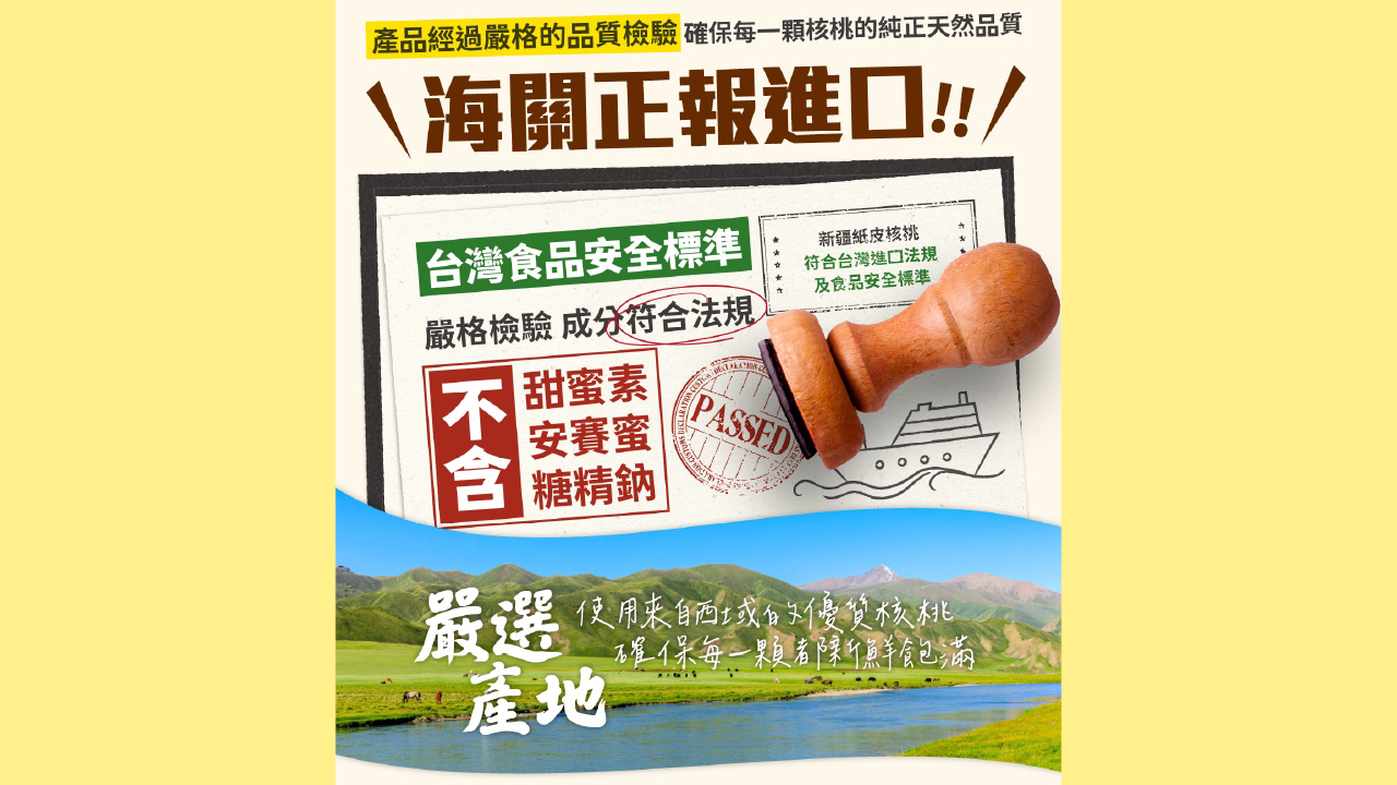 【西域果皇】的老闆表示,我們選用頂級的185品種紙皮核桃,通過正式報關進口,並經過FDA與SGS檢驗,確保每顆核桃都符合國際食品安全標準。從清洗、烘烤、包裝到出口,每一個環節我們都親自監控,保證產品的每一批都經過嚴格把關。從清洗到包裝,每一個細節我們都不容忽視。產品完成後,我們會立即抽樣送回台灣進行檢驗,確保產品符合食品安全規範。