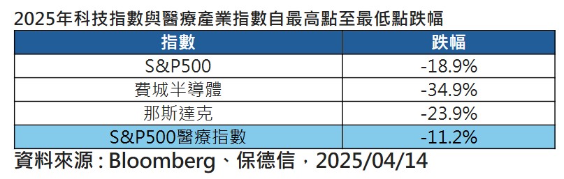 美國總統川普上台之後,全球金融市場不平靜,保德信統計年初以來,美國醫療產業指數XLV最大跌幅11.2%,反觀波動性較高的費城半導體指數,最大跌幅更達34.9%,美國S&P 500指數最大跌幅也達18.9%,相比之下,醫療產業相對抗震。