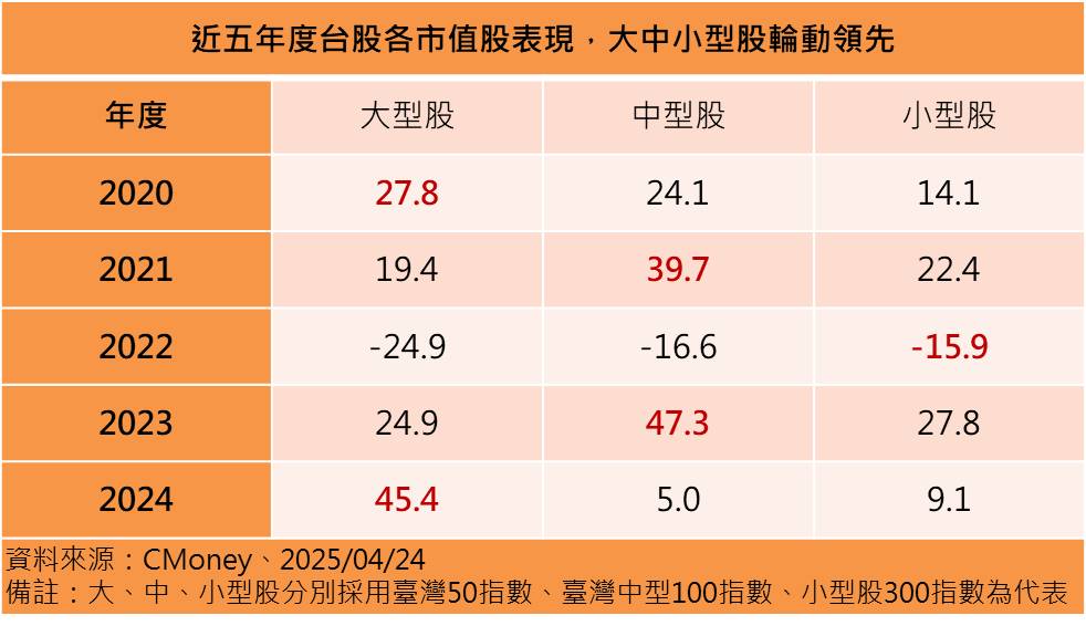 同樣即將在5月初募集的台股主動式ETF:群益台灣強棒(00982A),擬任經理人陳沅易表示,在經濟循環不同階段下,大型股與中小型股對於景氣反應不同,表現因而出現差異。回顧台股歷年表現,依市值將各股分群,可發現大型股、中小型股之間績效互有領先,以2024年來看,大型股表現明顯領先,指數漲幅45.4%。