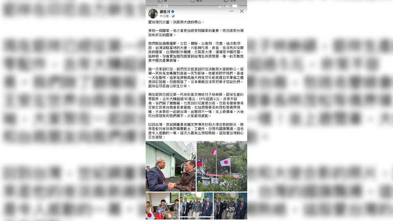 見證愛台灣的力量。財信傳媒董事長謝金河今日(25日)在臉書撰文指出,上周參加台灣財金文化金融家參訪團到印尼,與當地台貿中心、台商會、僑界領袖等單位,就印尼投資及工廠營運進行交流,他特別讚許我國駐印尼代表處大使洪振榮的熱心,不但參訪全程陪伴,讓他特別體會到,面對中國打壓我駐外單位的用心與努力。謝金河說,跟當地台商與僑界「大家聚在一起說台灣,感覺很不一樣!」對大家愛台灣的心感到特別感動。