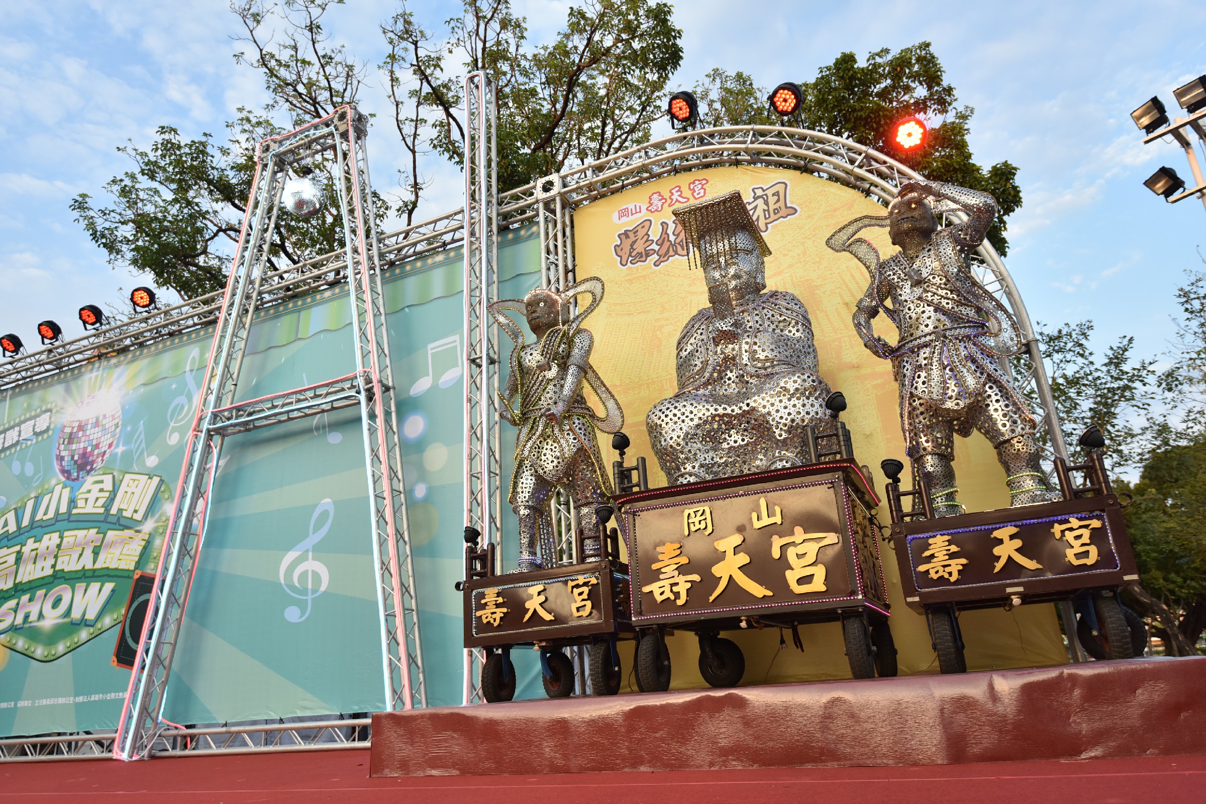 ↑圖說:岡山最注目、全世界唯一的「螺絲媽祖」在這次活動被請上台一起與鄉親們聽歌看戲(圖片來源:許智傑服務處提供)