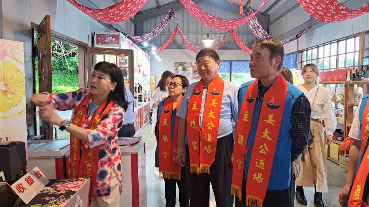 ↑圖說:鍾東錦至美食特產市集,為新住民攤商加油打氣,一起為苗栗拼經濟。(圖片來源:姜太公中部道場客家大院提供)