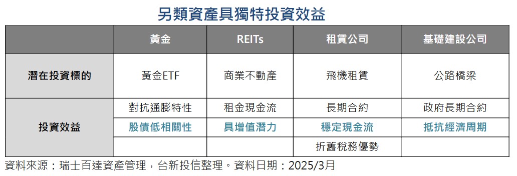 至於另類資產如黃金ETF、REITs、租賃公司、基礎建設公司等,價值不在於追逐最高的報酬,而在於獨特的投資效益,例如具有穩定現金流、對抗通膨、股債低相關性、長期合約、抵抗經濟周期循環等特性,靈活運用可為多重資產組合加分。