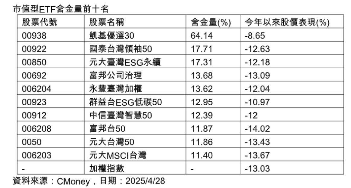 統計今年以來截至昨天,台股下跌約13%,而前述高含金ETF跌幅約8.65%~14%。