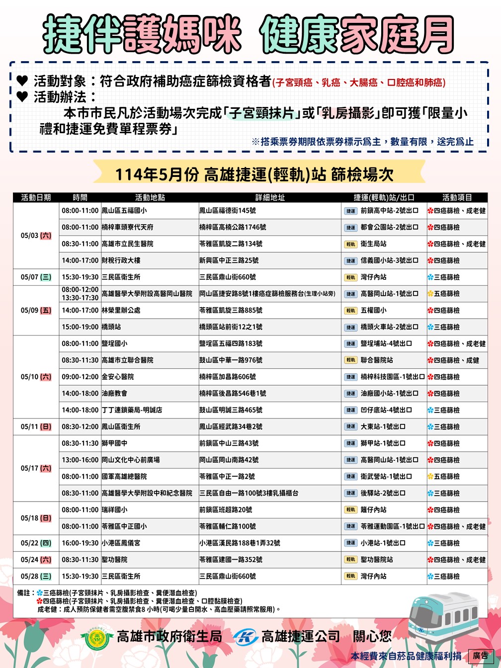 從5月1日起至5月底,「捷伴護媽咪 健康篩檢月」將在高雄捷運及輕軌沿線23個車站周邊展開婦女健康行動站。年滿25歲的女性完成子宮頸抹片檢查,或40至74歲女性完成乳房X光攝影,即可獲得高捷免費搭乘一次票券及精美小禮。同時,現場還提供口腔黏膜與糞便潛血等多項癌症篩檢,方便市民一次完成多重檢查。