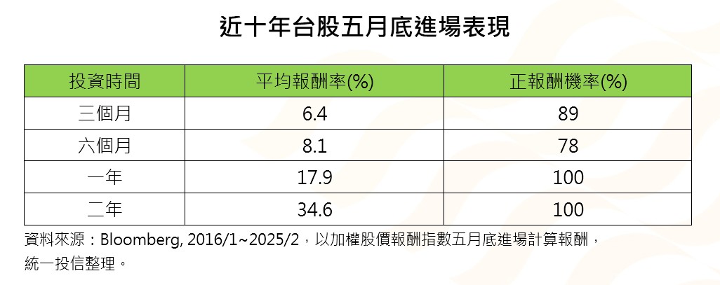 展望5月行情,統一投信表示,根據彭博統計過去十年數據,若投資人於5月底進場投資加權指數,持有3個月後的正報酬機率高達89%,持有1年和2年的正報酬機率甚至達到100%。