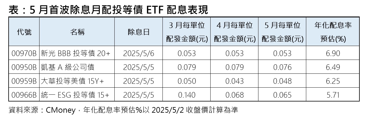 月配息、投等債ETF五月除息倒數!年配息率最高衝6.9% 一表掌握