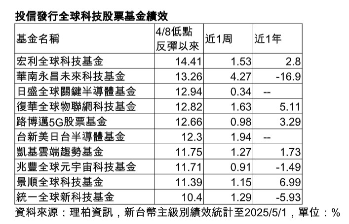 法人統計至5/1,MSCI世界資訊科技指數最新收盤點位為724.18,已高於關稅戰股災爆發前1日(4/2)的708.2,且近1周漲幅達4.2%,優於MSCI世界指數同期間的1.9%,也進一步帶動投信發行的全球科技股票基金自此波行情低點強彈,包括宏利全球科技、華南永昌未來科技、日盛全球關鍵半導體、復華全球物聯網科技、路博邁5G股票、台新美日台半導體等基金波段漲幅逾12%,表現相對亮眼。