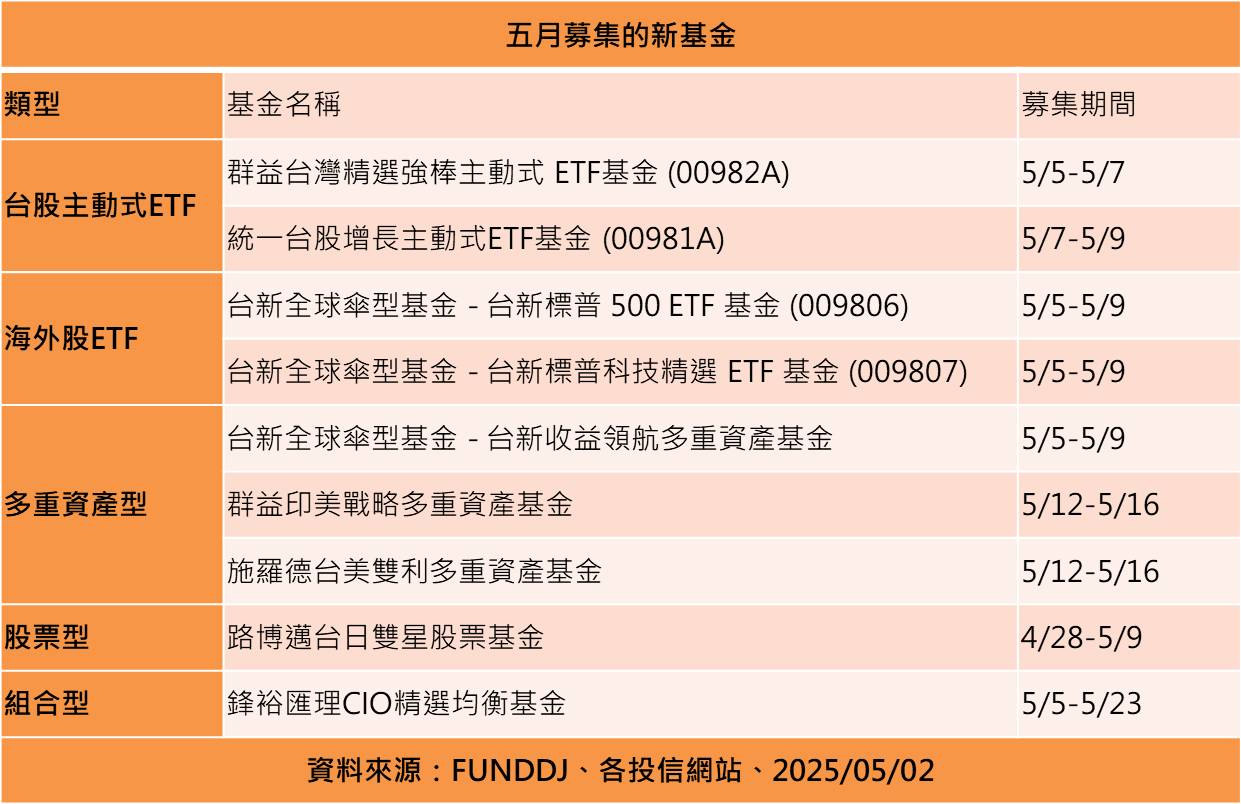 近期,各大投信也紛紛募集新基金,統計5月共計有9檔新產品要登場,是去年12月以來最多,從類型來看,ETF有4檔,包括2檔主動式台股ETF(00982A主動群益台灣強棒、主動統一台股增長),另外2檔ETF為海外股票ETF(台新標普500、台新標普科技精選)。